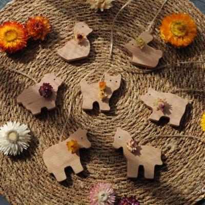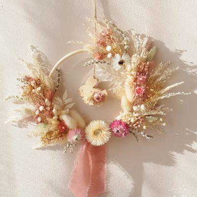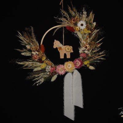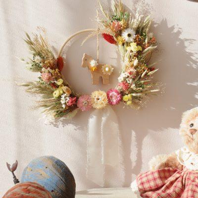 Décorez la chambre de votre enfant avec une charmante couronne murale composée de fleurs séchées délicates et d’un adorable animal en bois, créant une ambiance douce, naturelle et inspirante.