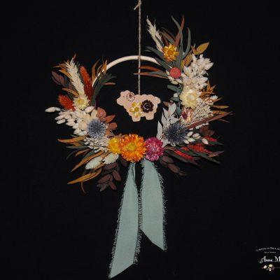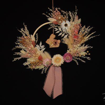 - Couronne murale pour chambre d’enfant composée de végétaux secs et stabilisés. Les couleurs douces, les textures variées et l’animal au centre de la couronne invitent les enfants dans un petit univers imaginaire.