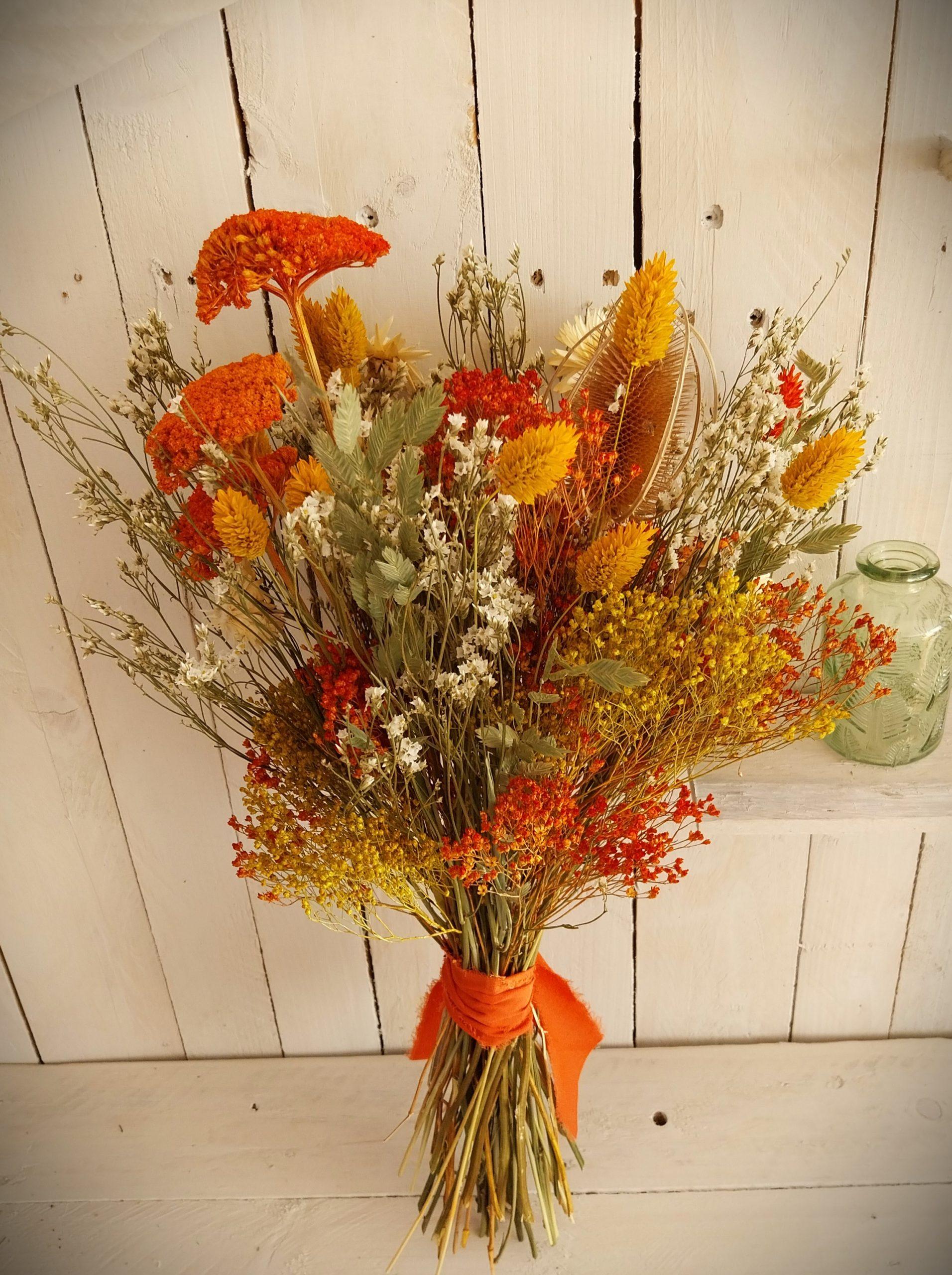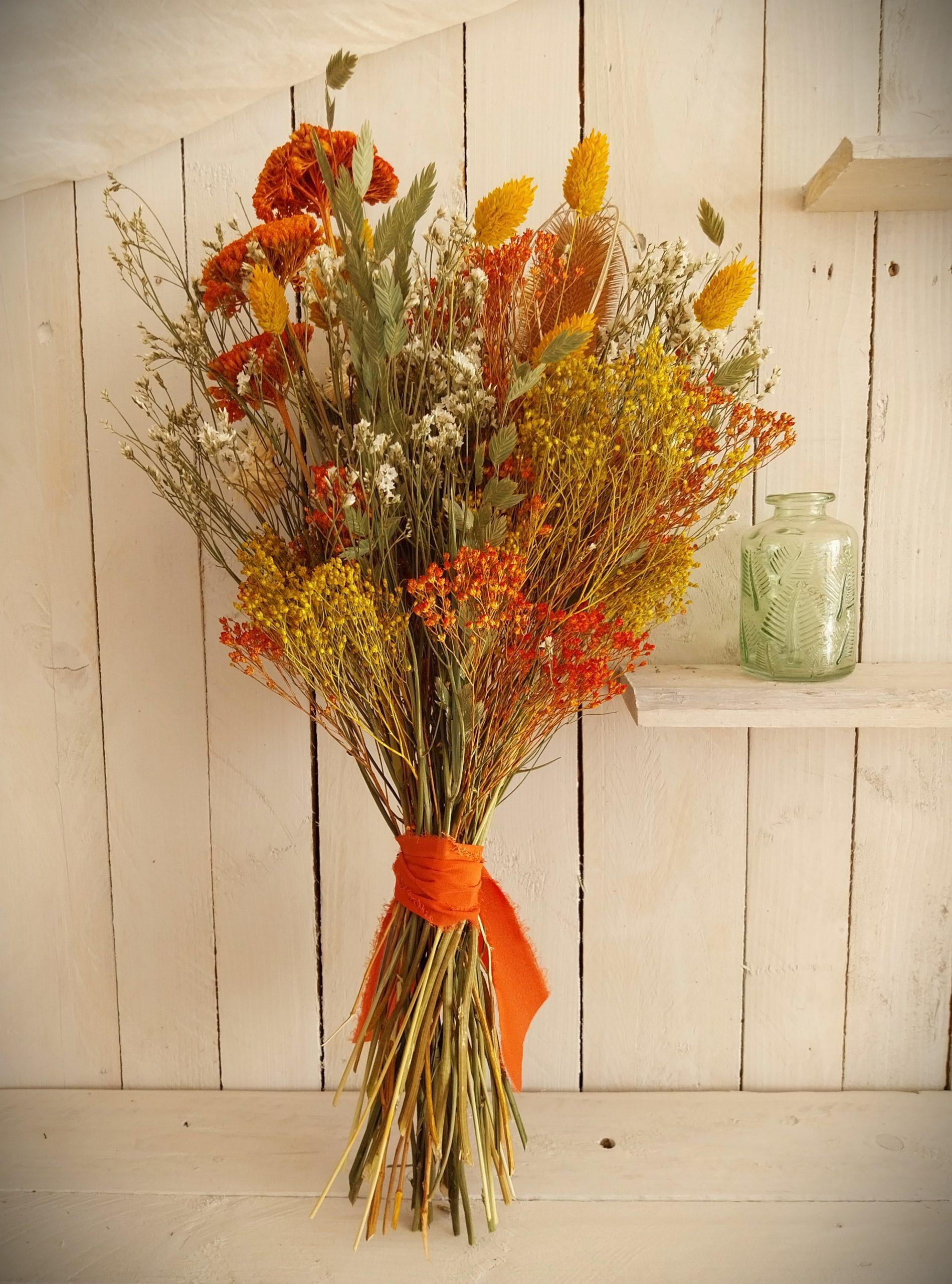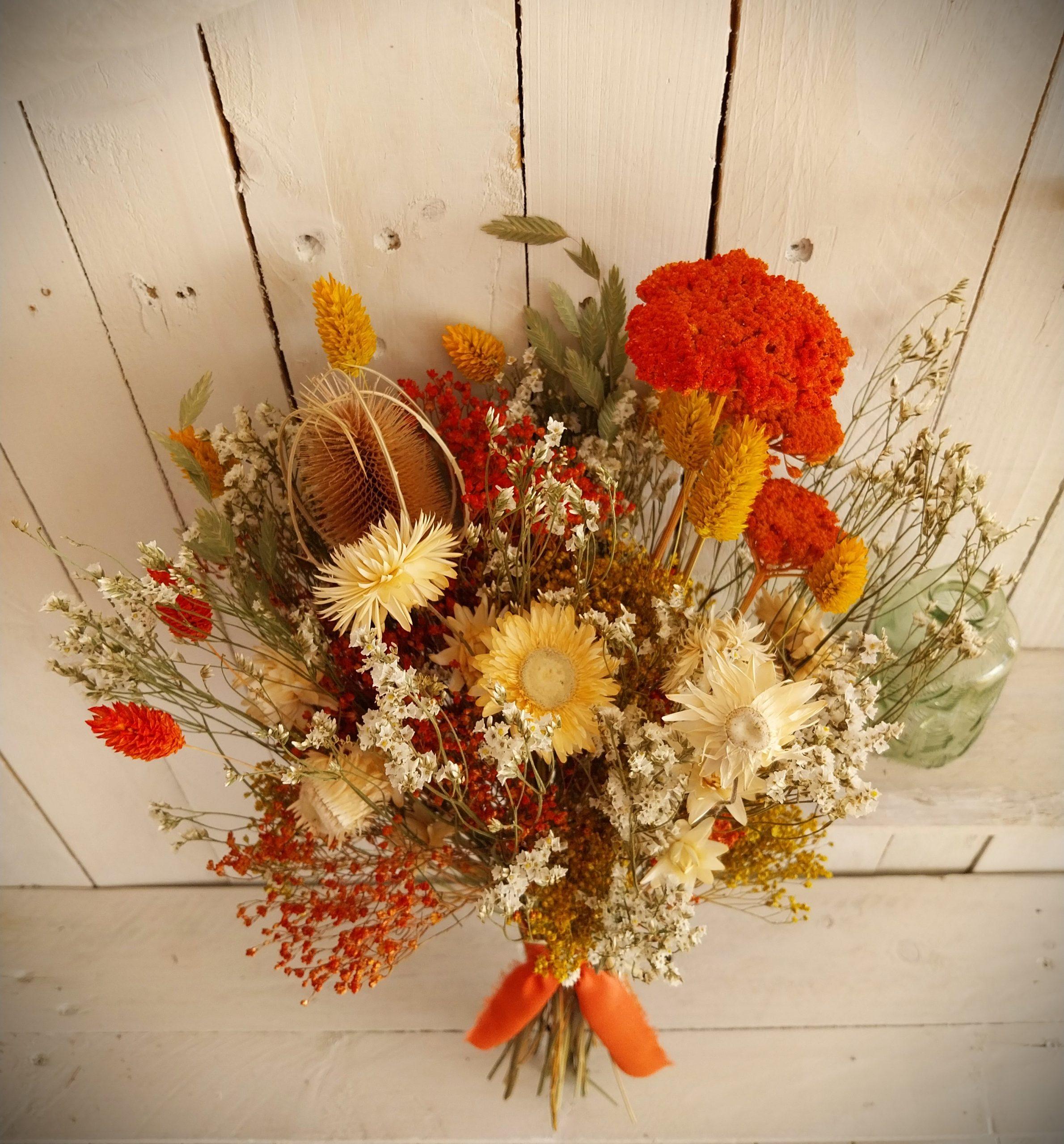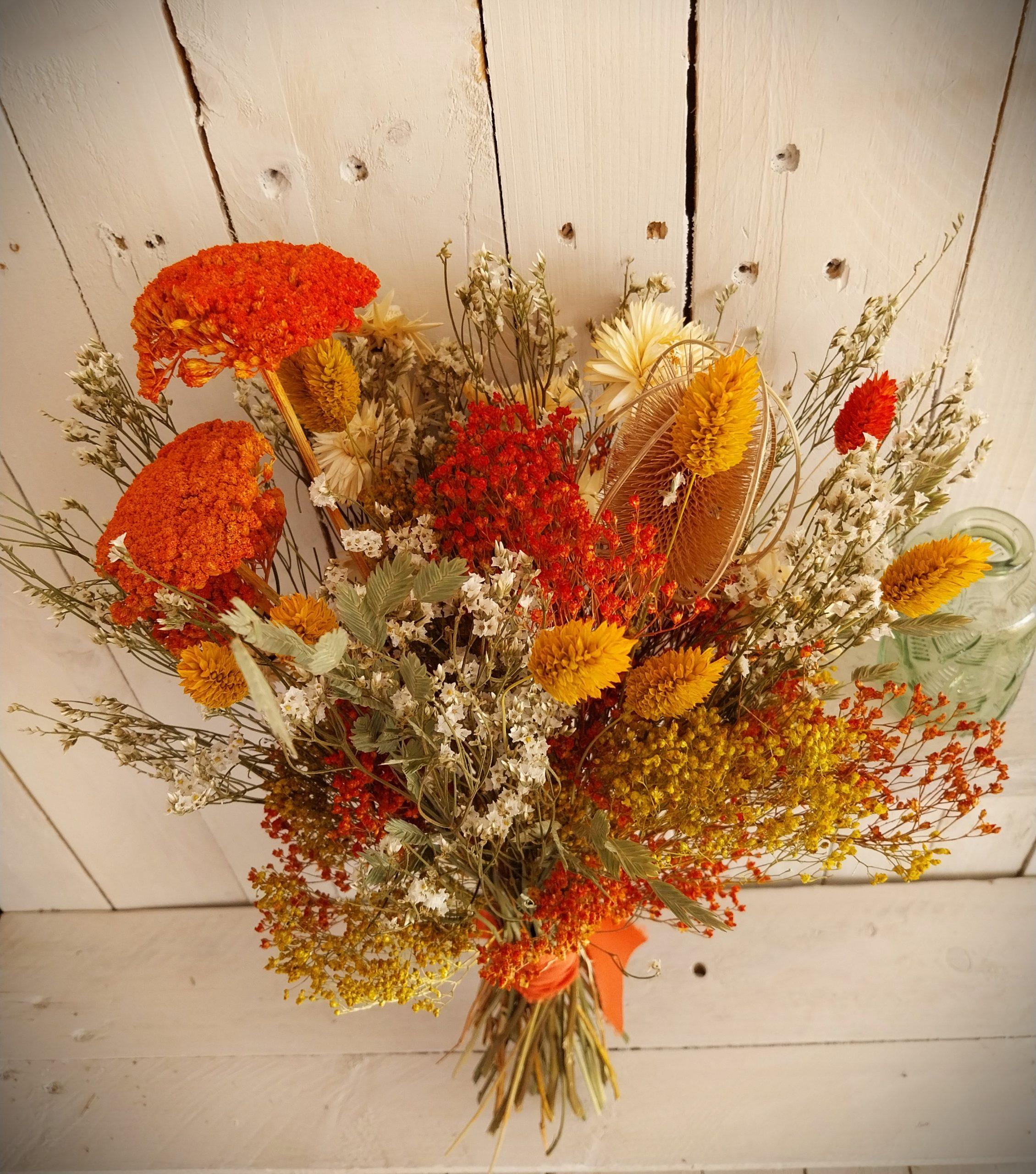 Le bouquet de fleurs séchées Achillée, aux tons chauds et printaniers, est uniquement composé de végétaux secs. Il apporte une atmosphère chaleureuse à votre intérieur.