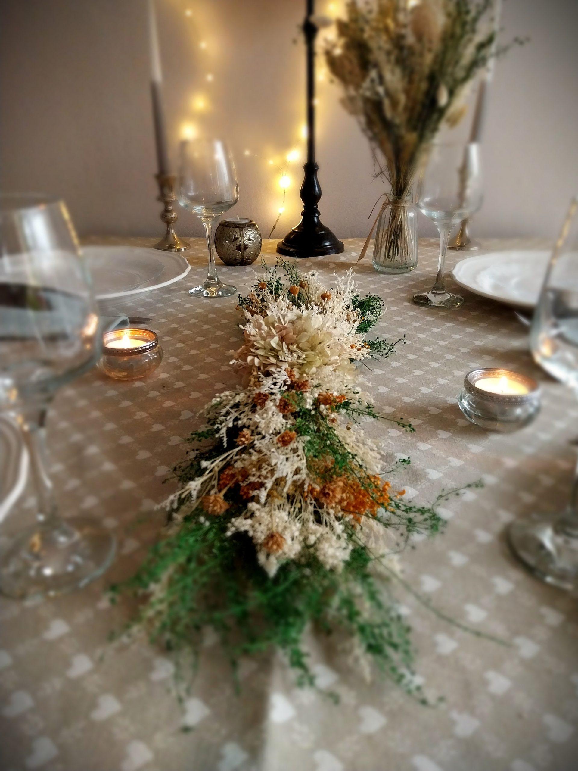 Le chemin de table Hill, aux tons frais et naturels, est composé de végétaux secs et stabilisés. Il s’intègre parfaitement dans tous types de décoration, sur une table, une bibliothèque, un linteau de cheminée ou une commode. Chaque modèle est unique.