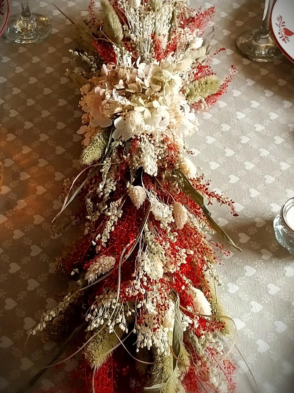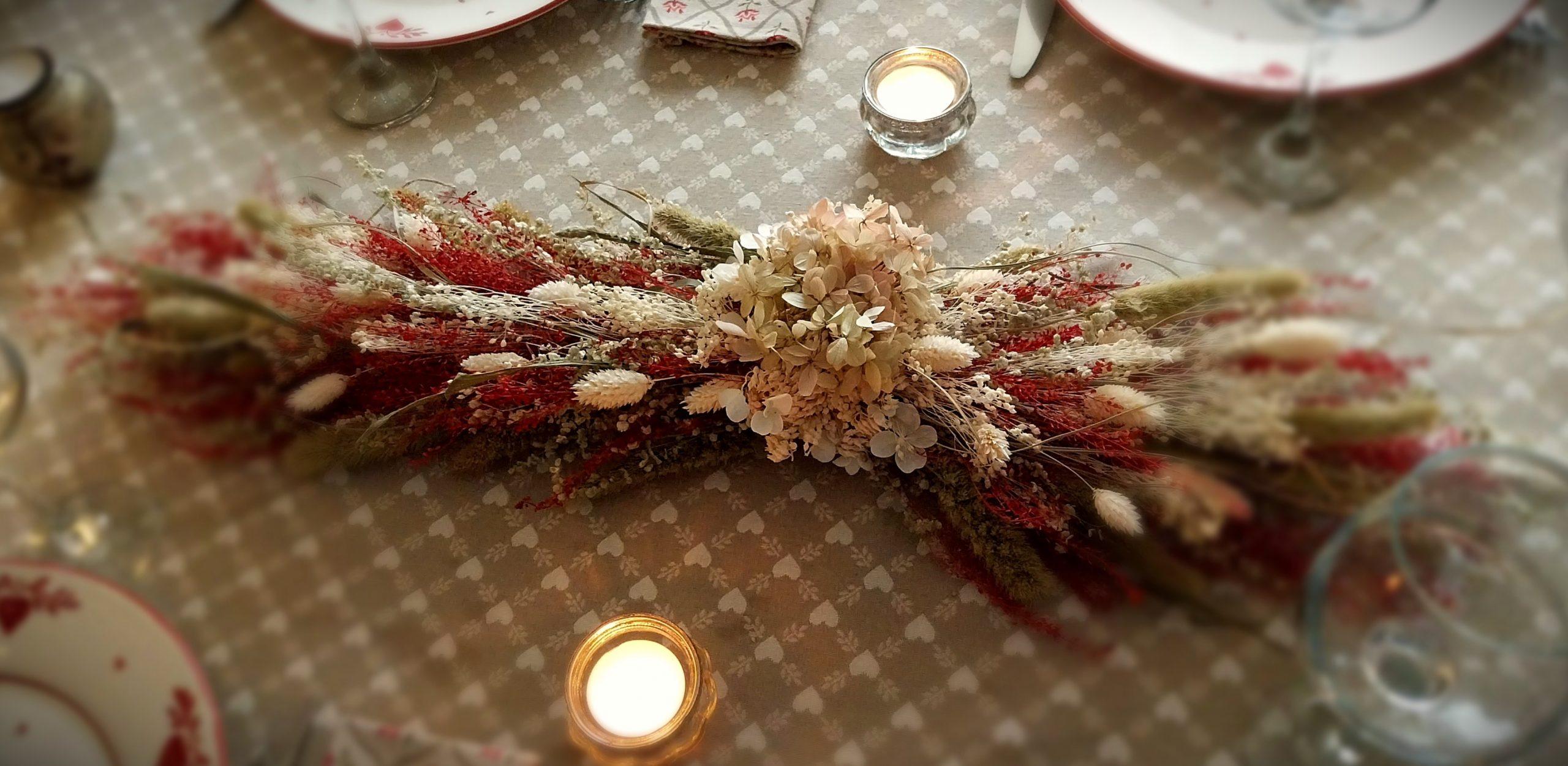 Le chemin de table Spiga, aux tons doux et contrastés à la fois, est composé de végétaux secs et stabilisés. Légèrement excentré, il s’intègre parfaitement dans tous types de décoration, sur une table, une bibliothèque, un linteau de cheminée ou une commode. Chaque modèle est unique.