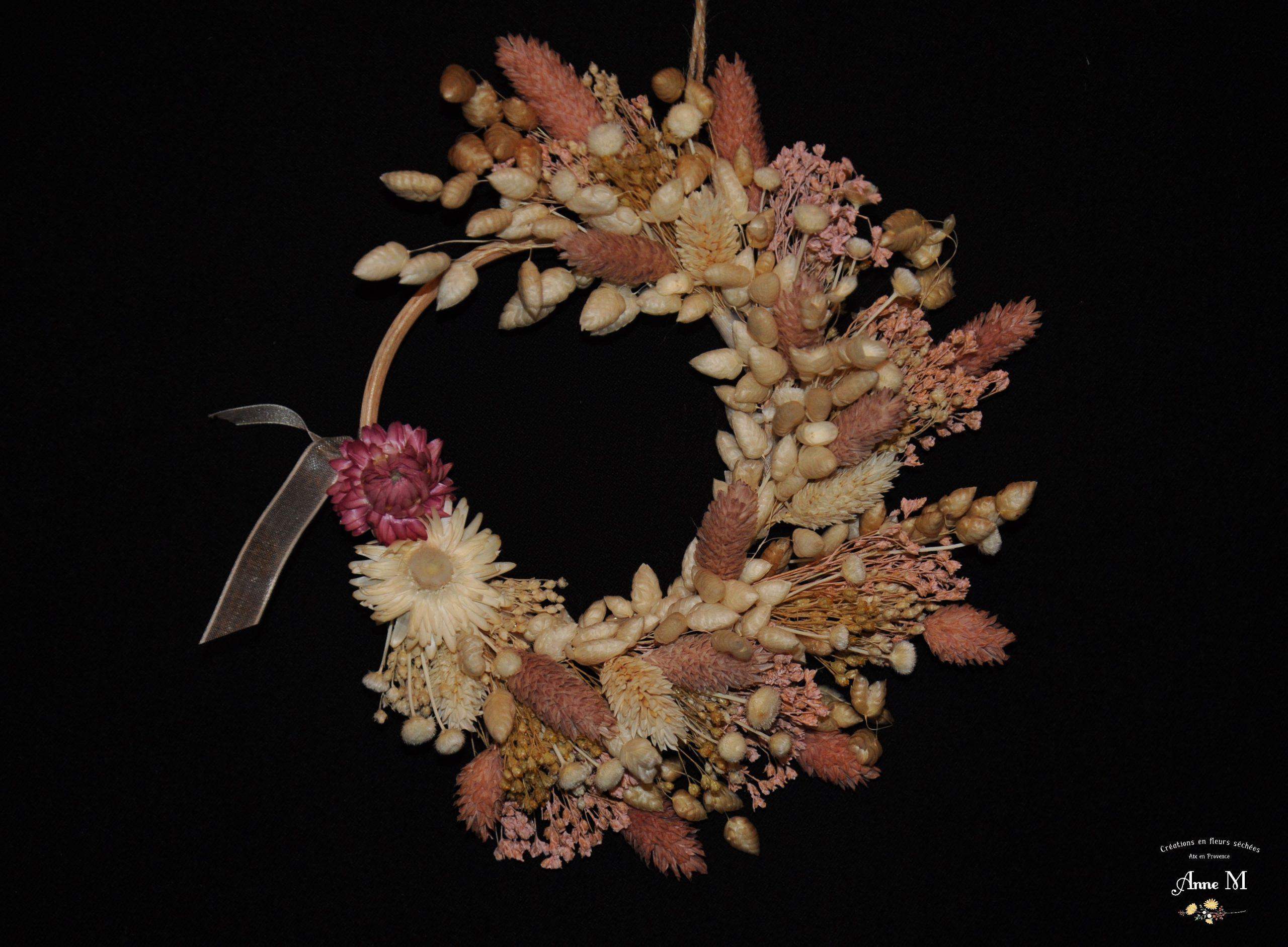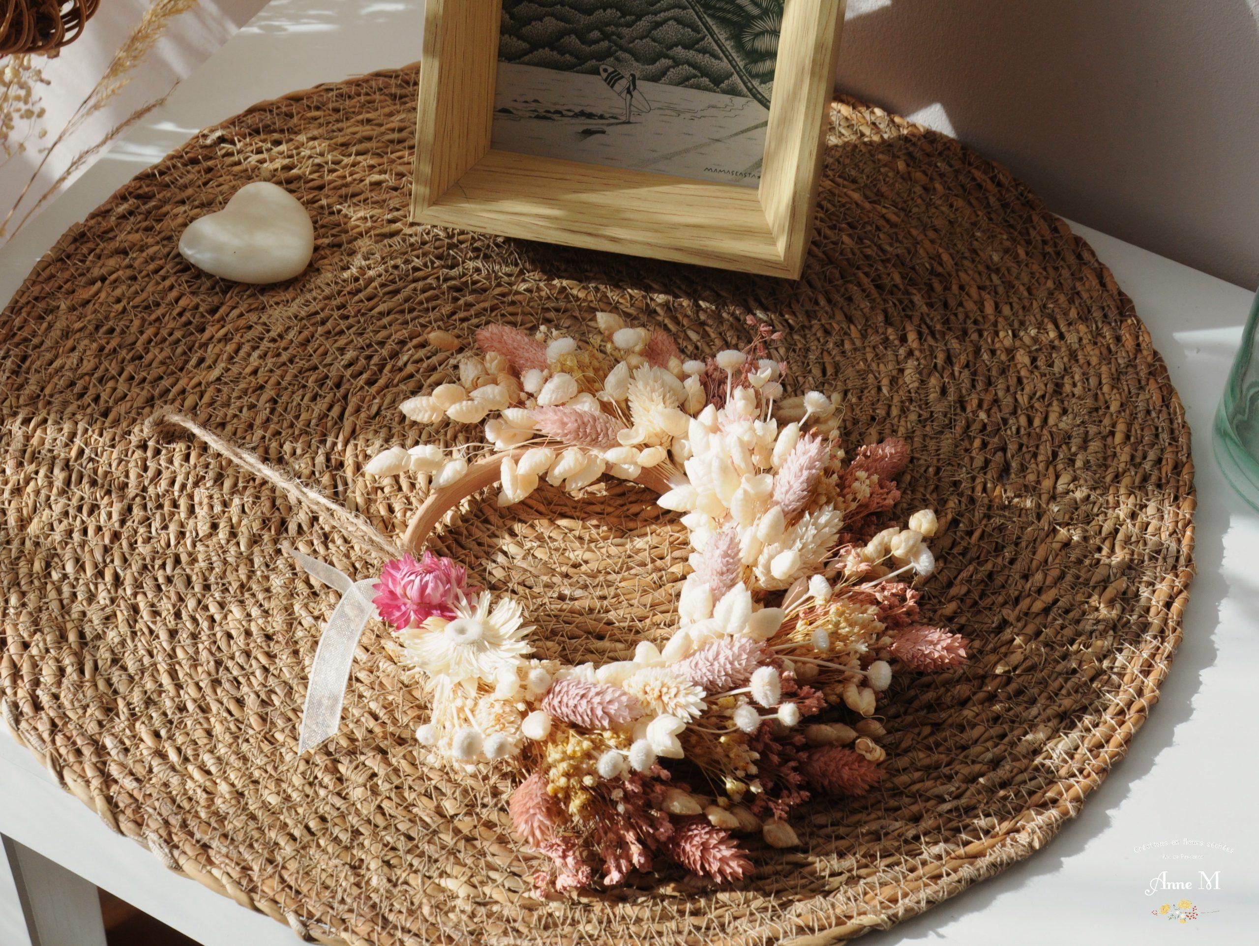 Petite couronne de fleurs séchées aux teintes douces, composée de végétaux secs.