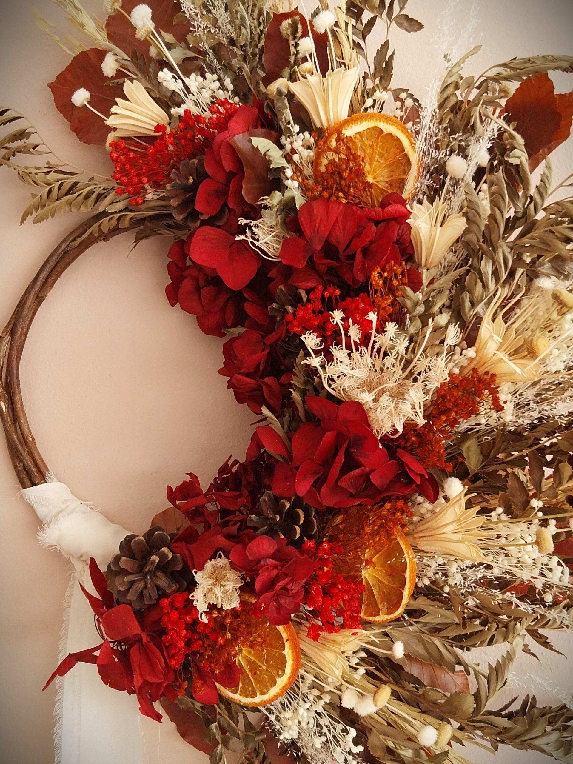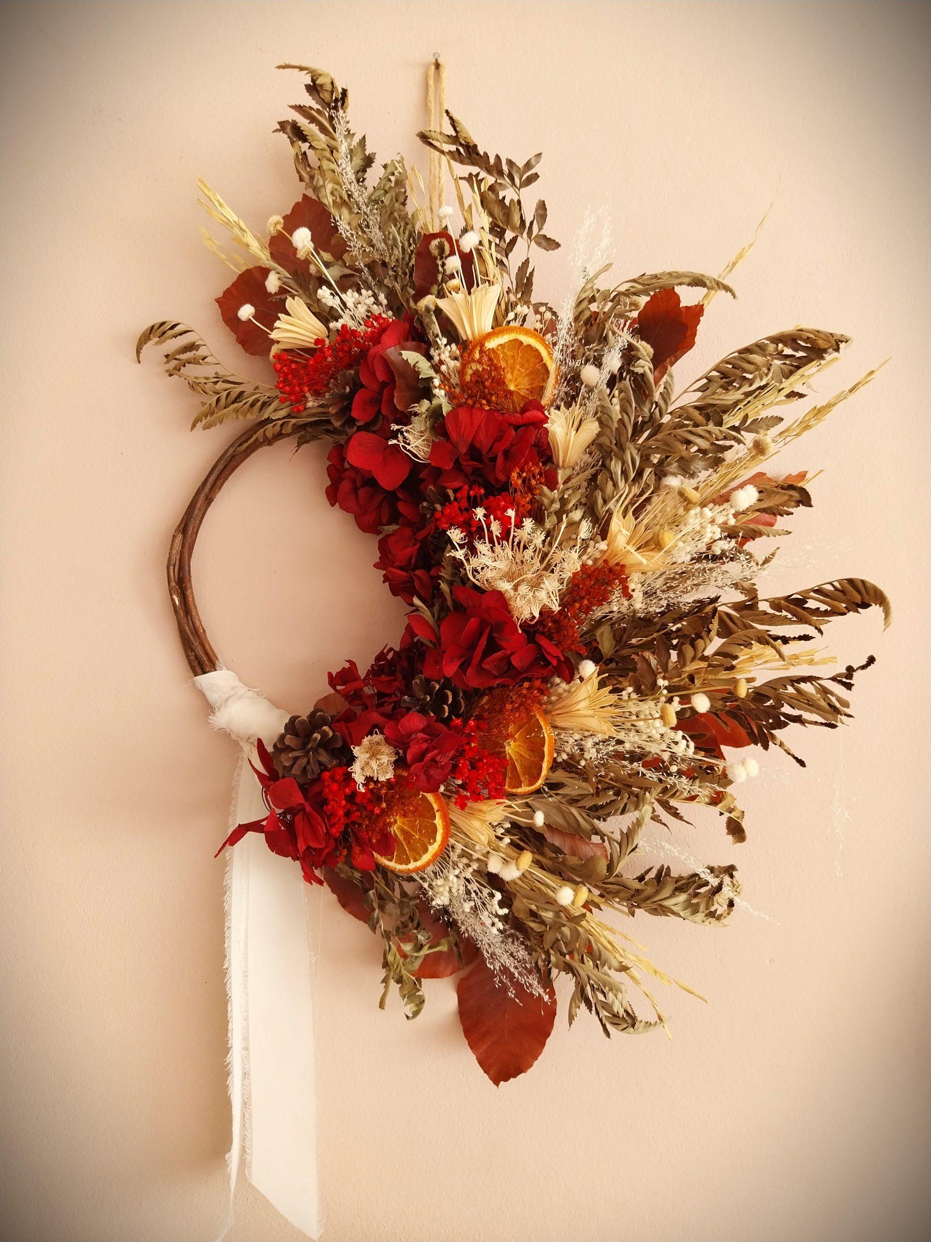 Couronne de fleurs séchées Fleur de riz en osier tressé à la main aux tons chauds et profonds, composée de végétaux secs et stabilisés. Elle est agrémentée d’un ruban blanc cassé en mousseline de soie effilochée et d’un cordon en jute naturelle.