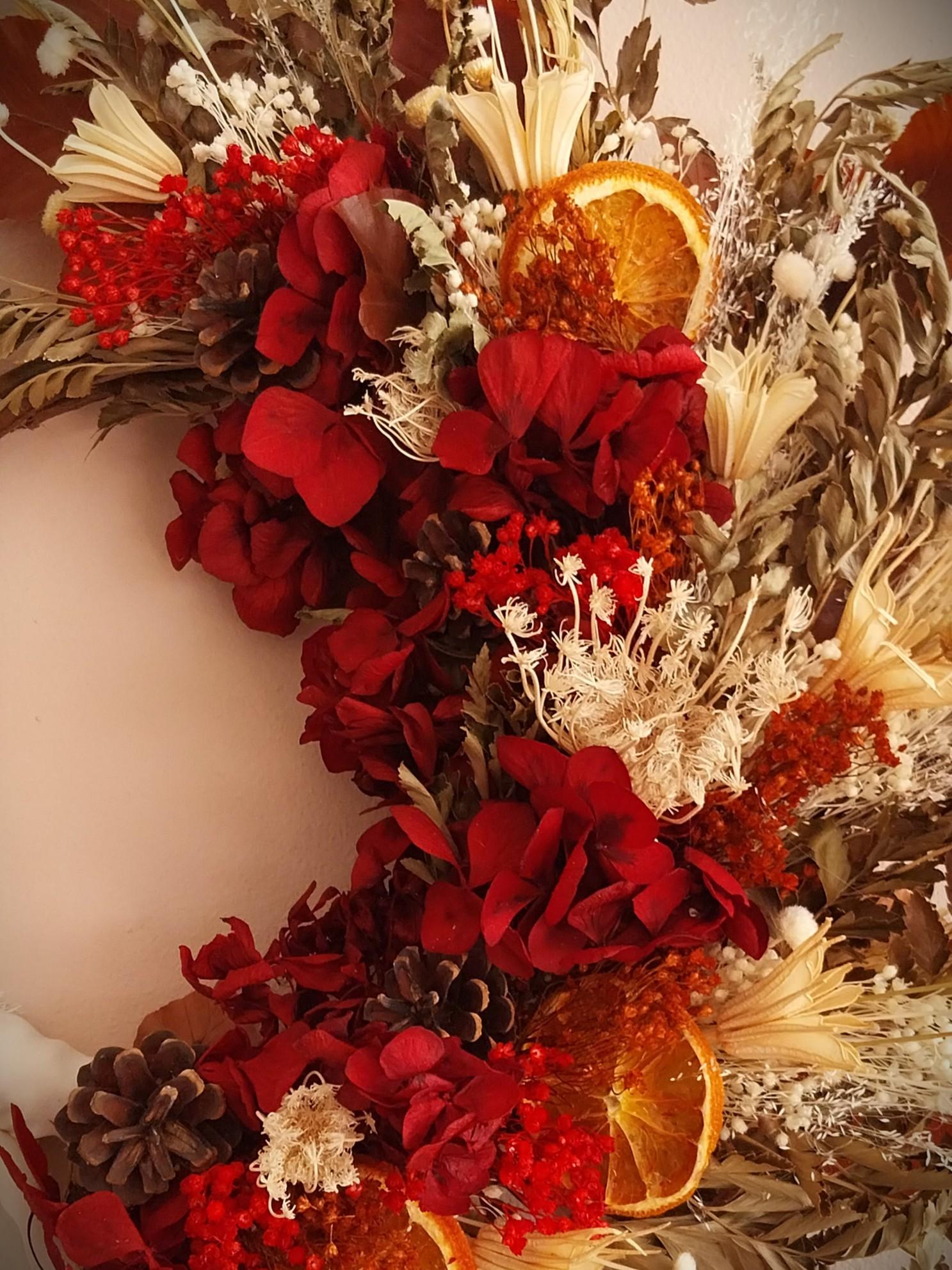 Composition : : fleur de riz, hêtre, broom bloom, fougère, star grass, amarelino, nigelle orientale, hortensia, pomme de pin et orange séchée.