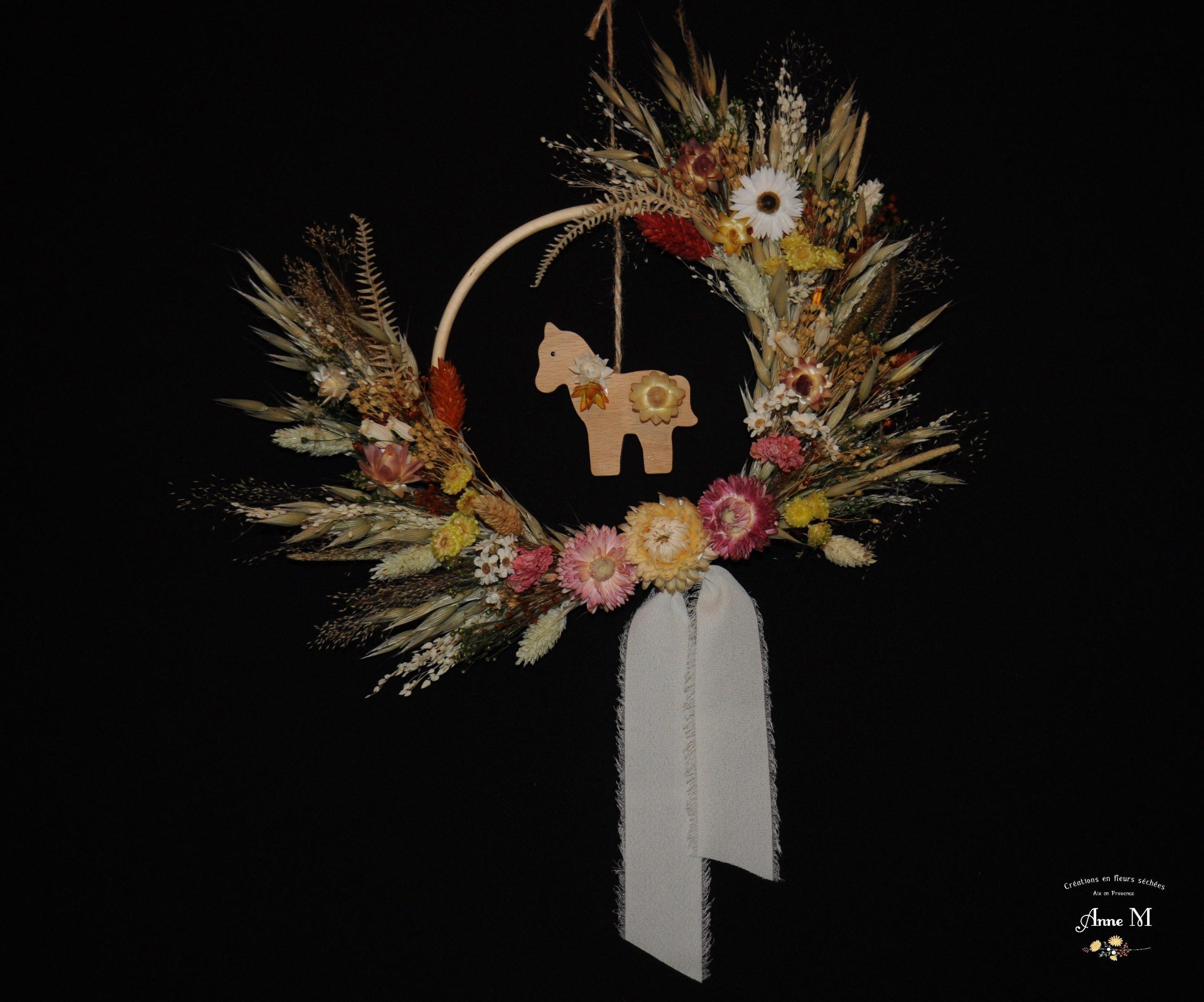 Couronne murale pour chambre d’enfant composée de végétaux secs et stabilisés.