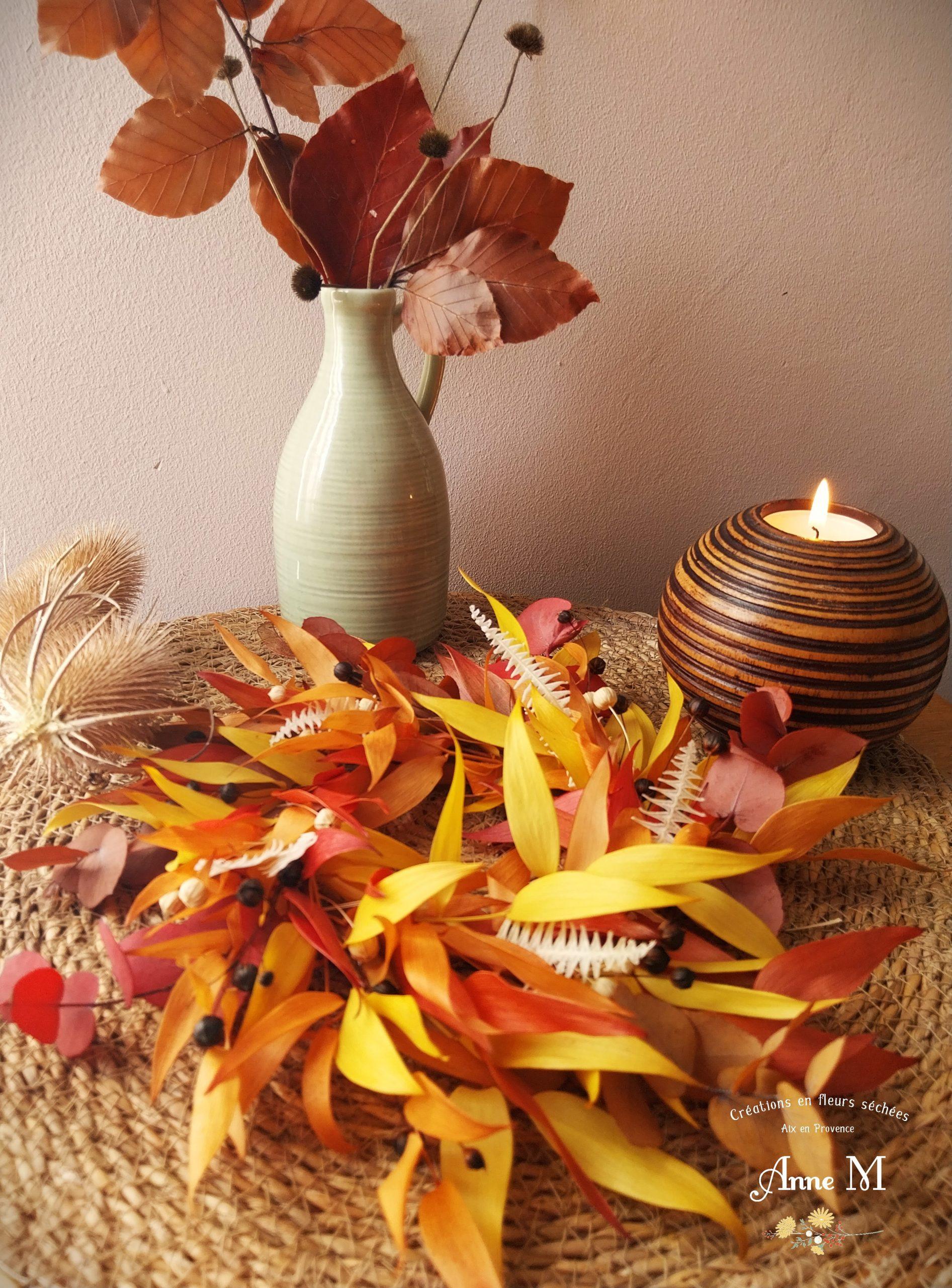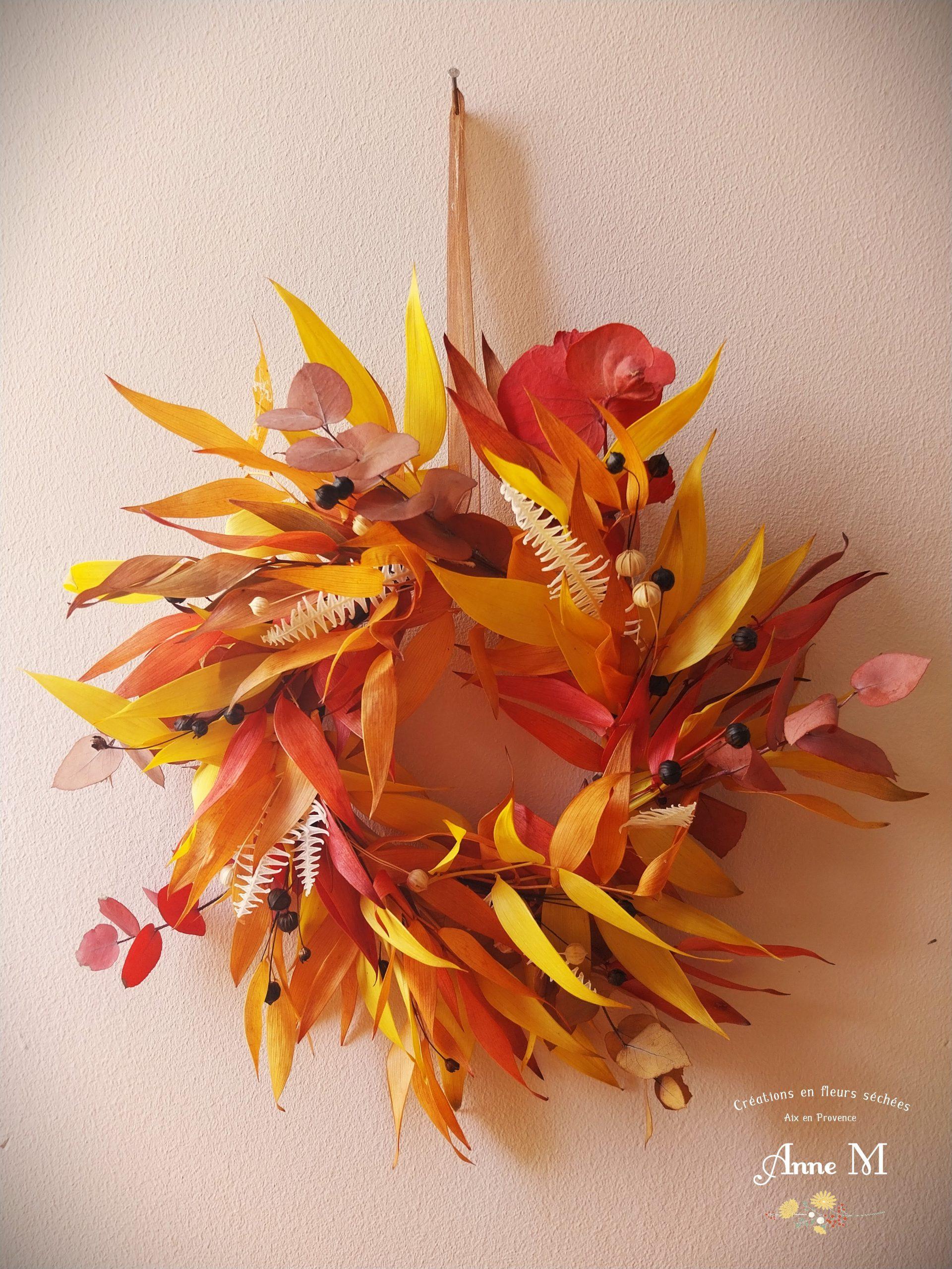 Couronne de fleurs séchées Ruscus au feuillage d’automne lumineux, composée de végétaux secs et stabilisés.