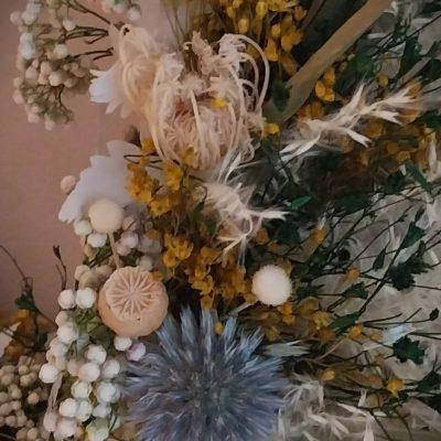 Composition : : nigelle orientale, broom bloom, pavot, solidago, végétaux glanés et lichen.