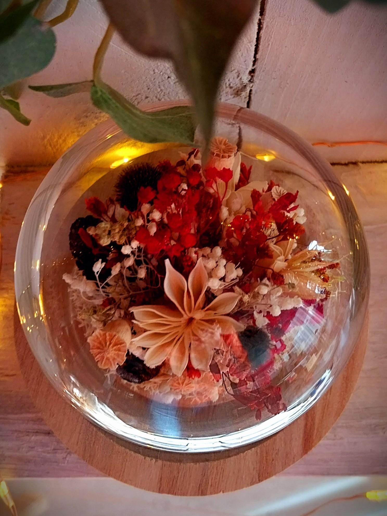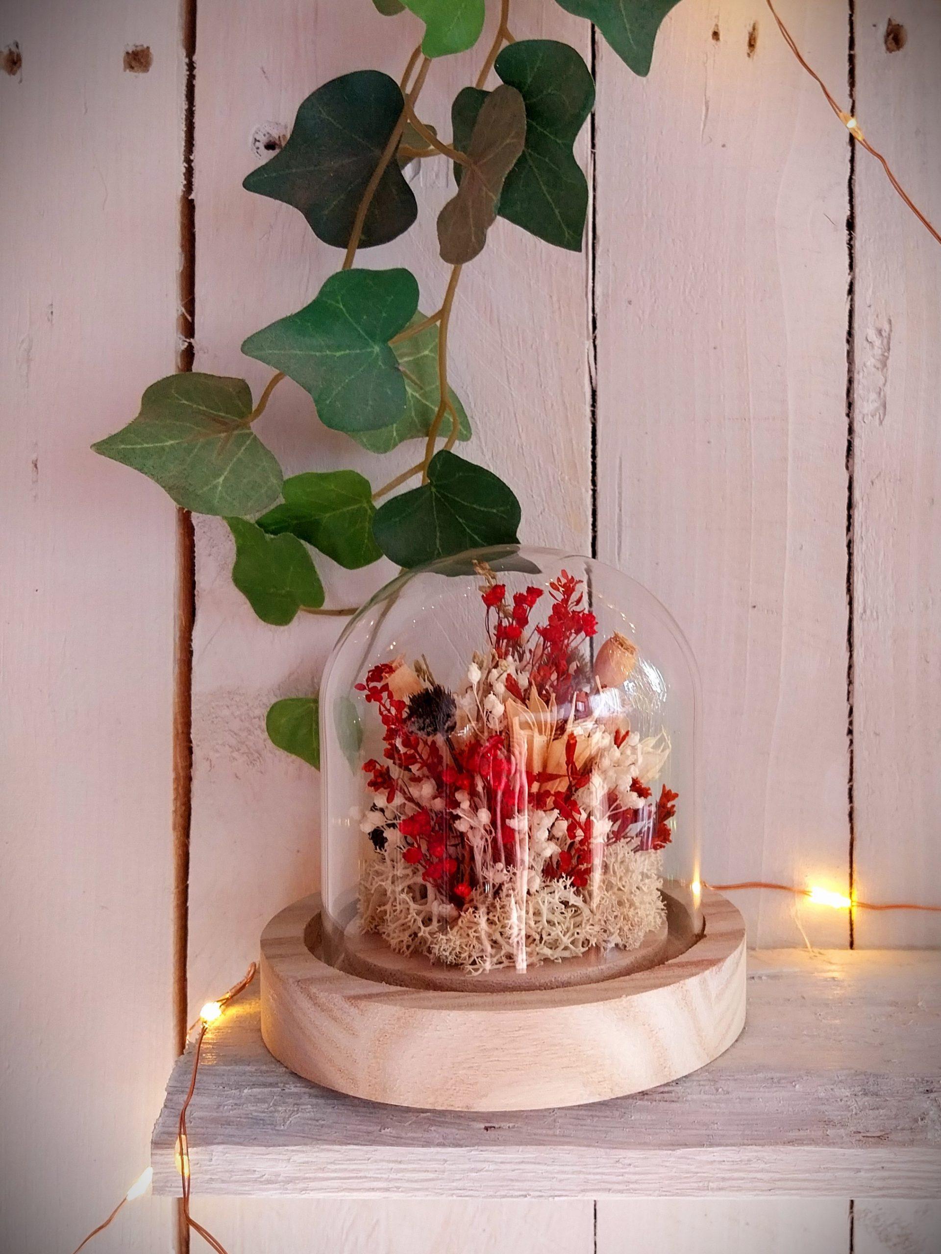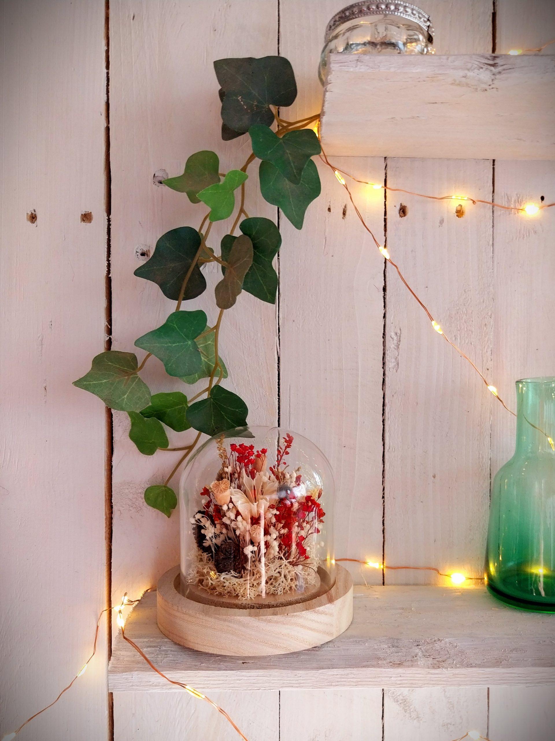 Le petit jardin sous verre Nigelle, aux tons chauds et naturels, est composé de végétaux secs et stabilisés. Parfait pour décorer un bureau, une bibliothèque, une chambre ou même votre table.